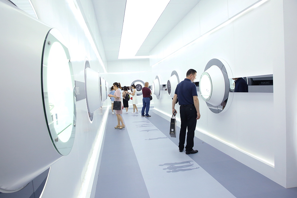 今年的雷諾表展館展臺以波浪形的表帶及表盤合成抽象的圓形表盤,并配以燈光,極具視覺沖擊力,白色的線條猶如鋼琴的琴鍵,流暢而優(yōu)美,環(huán)繞展臺四周,時間與優(yōu)雅的生活完美融合,并在入口處設置時光隧道,光影穿梭,引領全新的商務體驗和潮流。展館內的流水幕墻,寓意著時光的流動完美融合其中,展示效果更為生動。