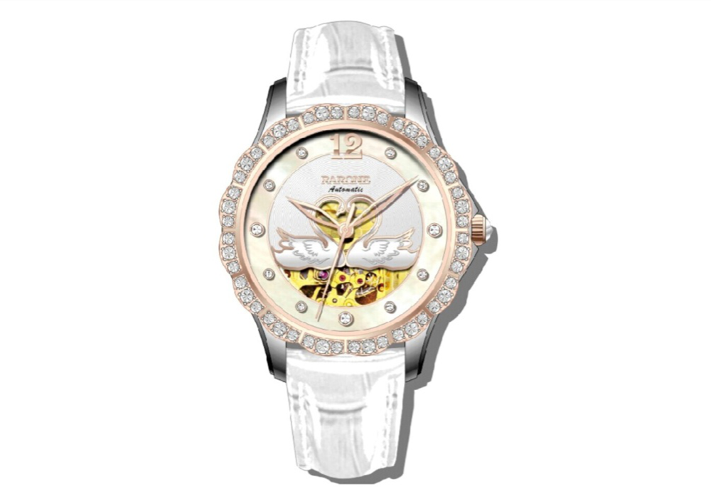 主打知性商務風的夜色系列,在去年推出備受市場歡迎的“天鵝守護”陶瓷款之后,再度升華“守護”概念,加入更多代表幸運的“水晶”元素,花瓣形表圈鑲嵌48顆不對稱水晶石,增添腕表的璀璨與時尚,天然貝母面,使腕表更優雅華美。表盤中心兩只天鵝相依成心形,象征忠貞不渝的愛情和守護,極致唯美浪漫。