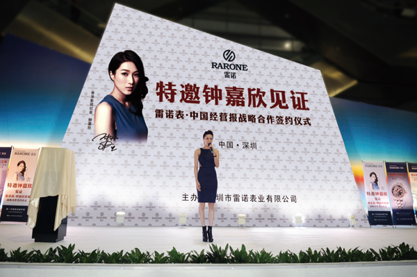 當(dāng)天,鐘嘉欣現(xiàn)身雷諾“古典話筒”展館,引爆現(xiàn)場(chǎng)高潮氣氛,成為整個(gè)展覽的焦點(diǎn),秒殺不少菲林。下午5時(shí),鐘嘉欣佩戴雷諾贈(zèng)送的手表,與雷諾表業(yè)董事長(zhǎng)詹西洲、總經(jīng)理詹江洲、《中國(guó)經(jīng)營(yíng)報(bào)》社長(zhǎng)韓曦晨共同揭開“藝術(shù)之旅”系列新表款的神秘面紗,正式對(duì)外發(fā)布這一全新系列的新表款。